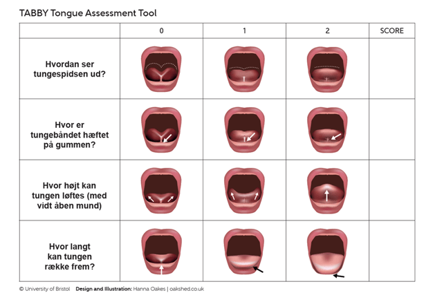 Bevægelighed og udseende af tungen vurderes ved TABBY score (Tongue-tie and Breastfed Babies Assessment Tool). Der kan ses et billede nedenfor.5