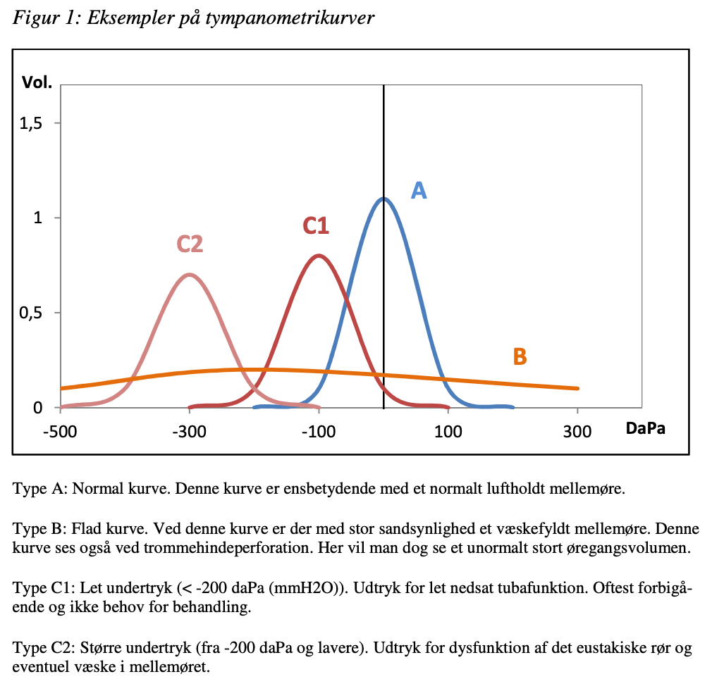 Ovenstående billede viser de forskellige kurver ved en tympanometri. Billedet er fra SST, NKR – Behandling med trommehindedræn 2015.