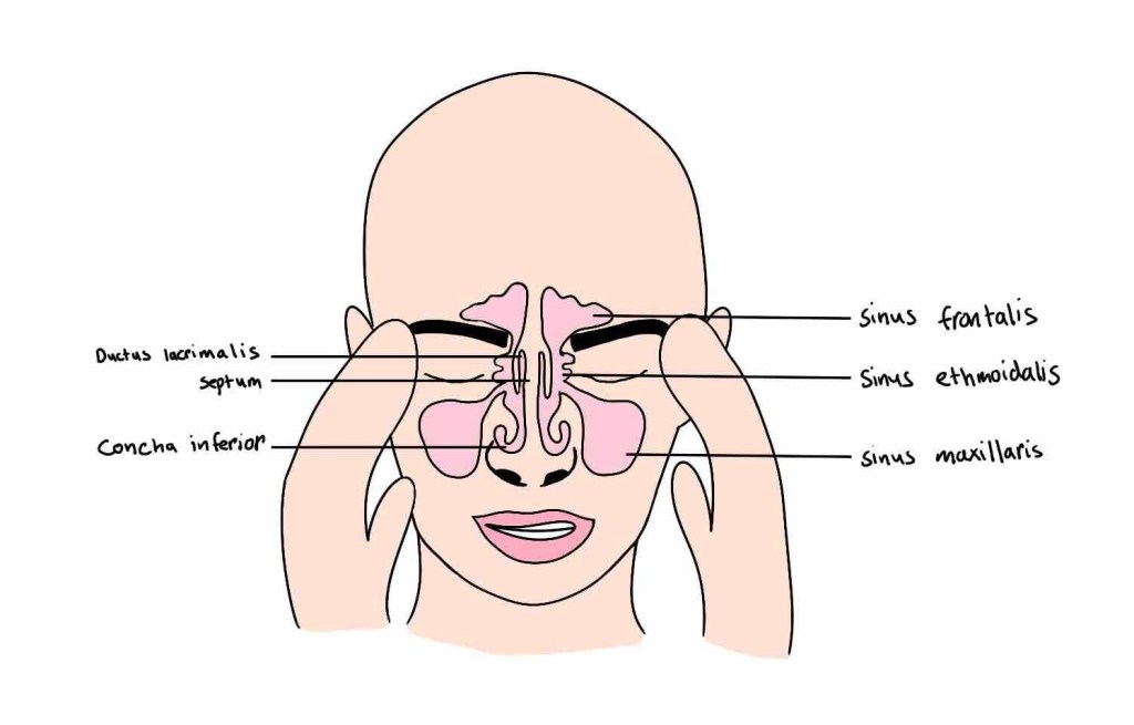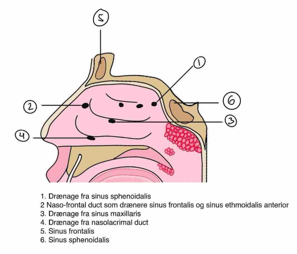 - Sinus maxillaris – Kæbehulen. Den største bihule. Dræner sig i meatus medius.