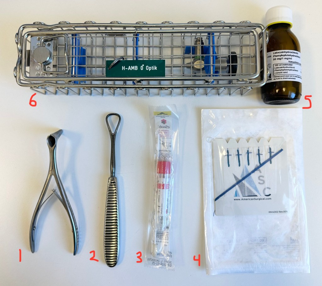- Der kan laves nasal endoskopi med fleksibel laryngoskopi eller et rigid skop, mhp vurdering om der er pus i meatus medius.